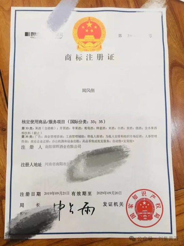 就比如:我们的商标名称是“闻风倒”,2018年注册,在南阳荣晖酒业有限公司的名下。因为今年看了一本叫《品牌农业》的书,书中讲了一个类似叫“三势合一”的理论(三势合一指:公司名称、商标名称与品牌市场宣传),故而今年又注册了一家企业,叫河南闻风倒酒业有限公司。当然了,也可以选择把原有企业进行企业名称变更。